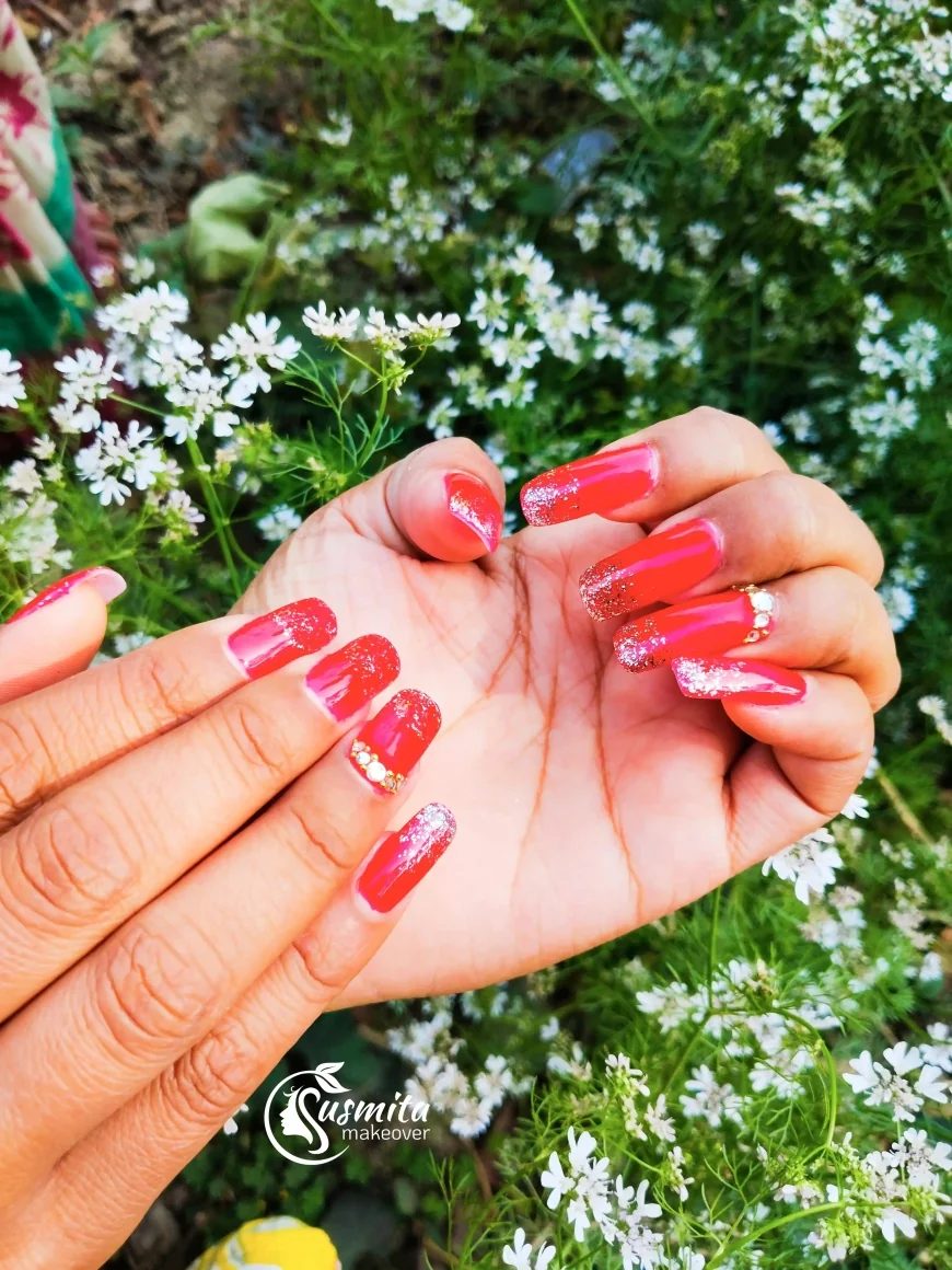 This red glitter ombre nail art is perfect for weddings, festive celebrations, parties, anniversaries, and special photoshoots. It pairs beautifully with traditional outfits, evening gowns, and modern dresses. Whether you’re a nail artist looking for trendy inspiration or someone searching for an elegant nail design, this look is a must-try.